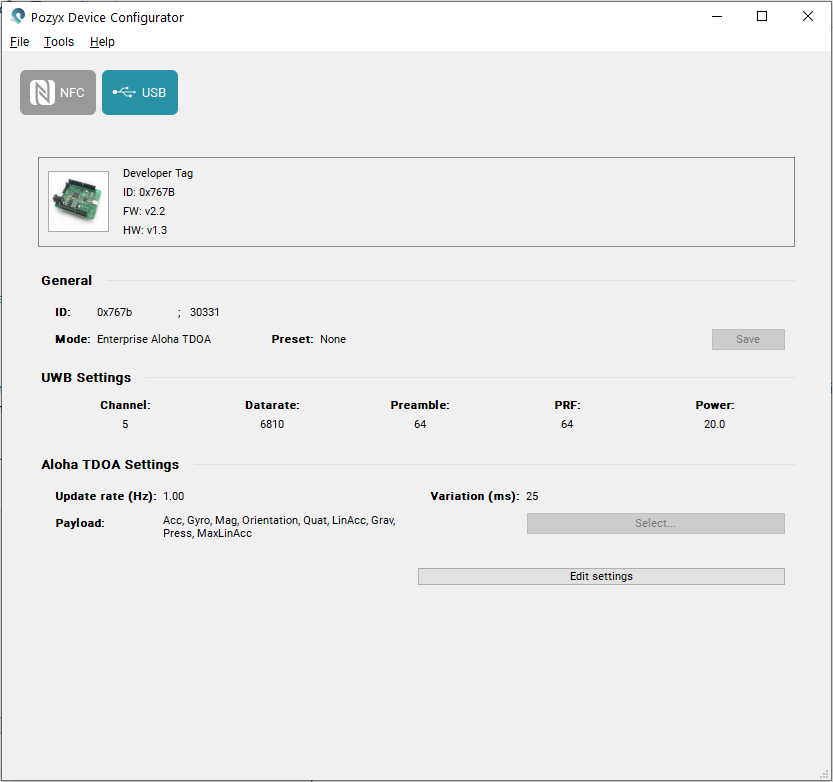 Configuration of the Developer Tag is in contrast to the Industrial and Wearable tag done via USB, so not via the NFC reader.