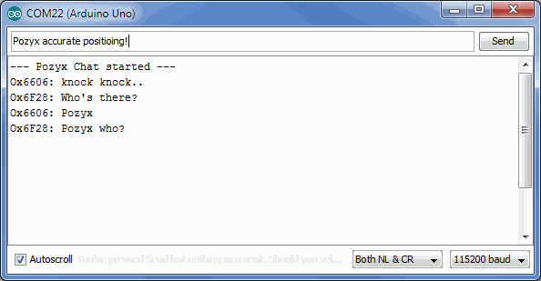 Open up the chat room example in the Arduino IDE under File > Examples > Pozyx > chat_room. This example requires two or more pozyx shields and an equal number of Arduino's. In this example, it will be possible to chat wirelessly with all pozyx devices in range. Below is a figure of two devices talking. To run this demo, make sure that the serial monitor runs at 115200 baud with "both NL & CR" enabled.