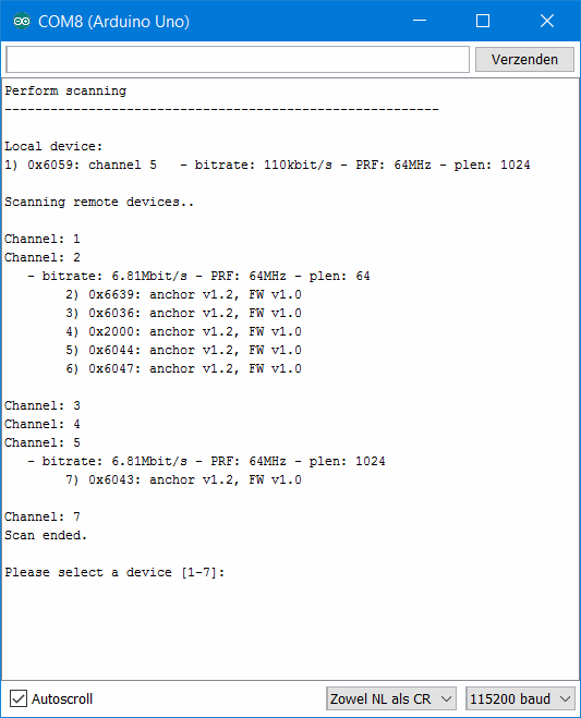 For this part, no coding is necessary as we will use one of the Arduino sketches included in the Pozyx library that will guide you through the configuration. Start by opening the sketch pozyx_UWB_configurator that can be found under File > Examples > Pozyx > useful. Upload the sketch to an Arduino equipped with a Pozyx shield and open the serial monitor. Once the sketch starts, it will search and show all Pozyx devices in range with their respective UWB configuration settings. This is an example output of the sketch as viewed in the serial monitor: