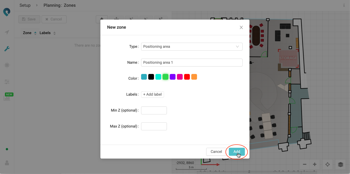 In order to add some context to the floorplan you can define zones on your floorplan using polygons. Three types of zones are supported: