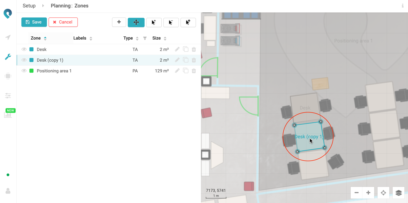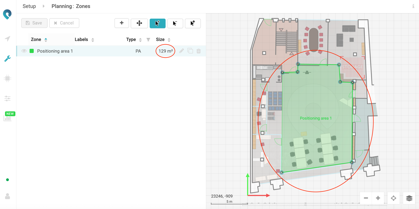 Positioning area: These are zones in which tags can be located. They are used to filter out positions that fall outside of them.