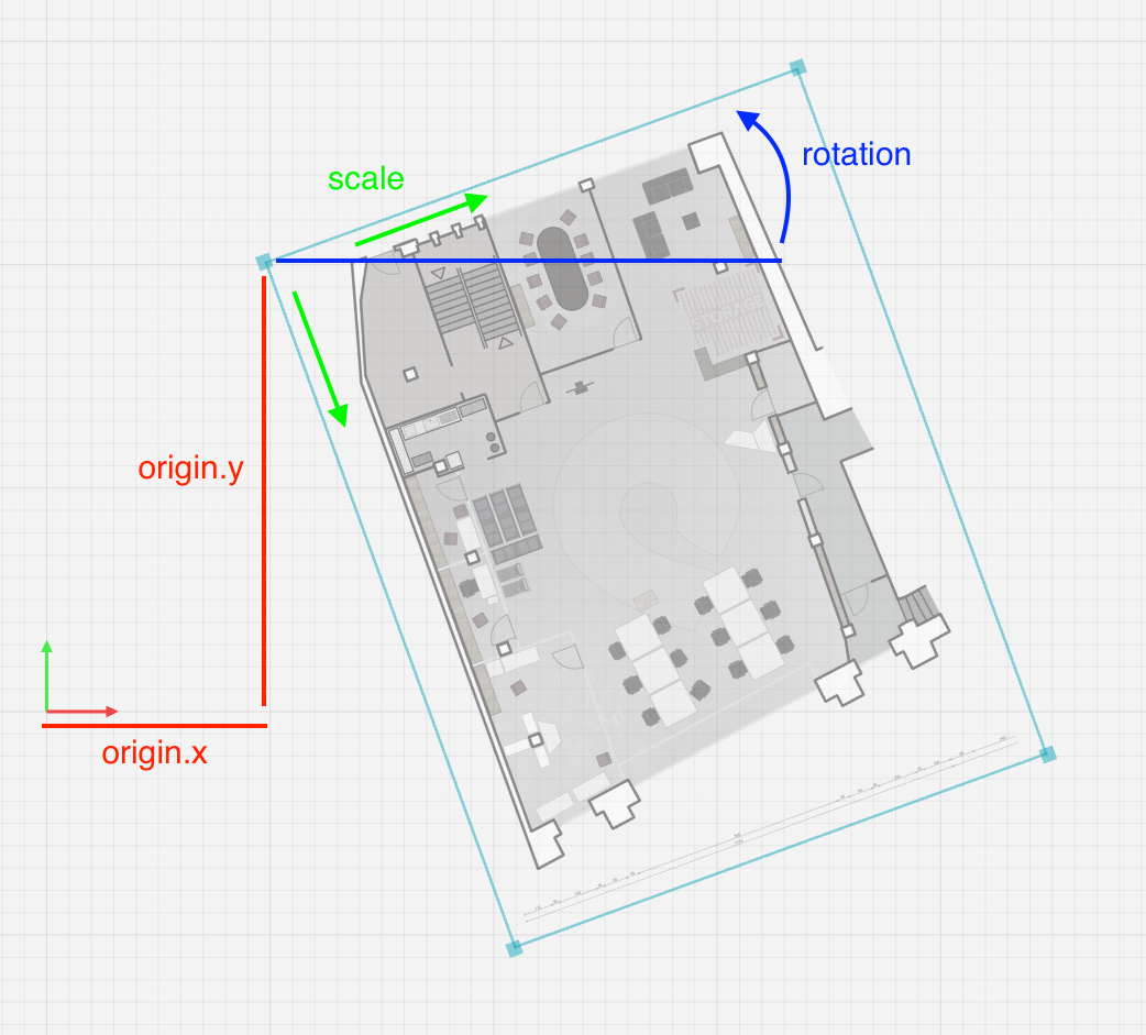 The floor plan can be edited in the Pozyx web application (Adding a floor plan). The floor plan settings and image file can also be retrieved and modified using the HTTP API. Following guidelines can help you interpret those settings: