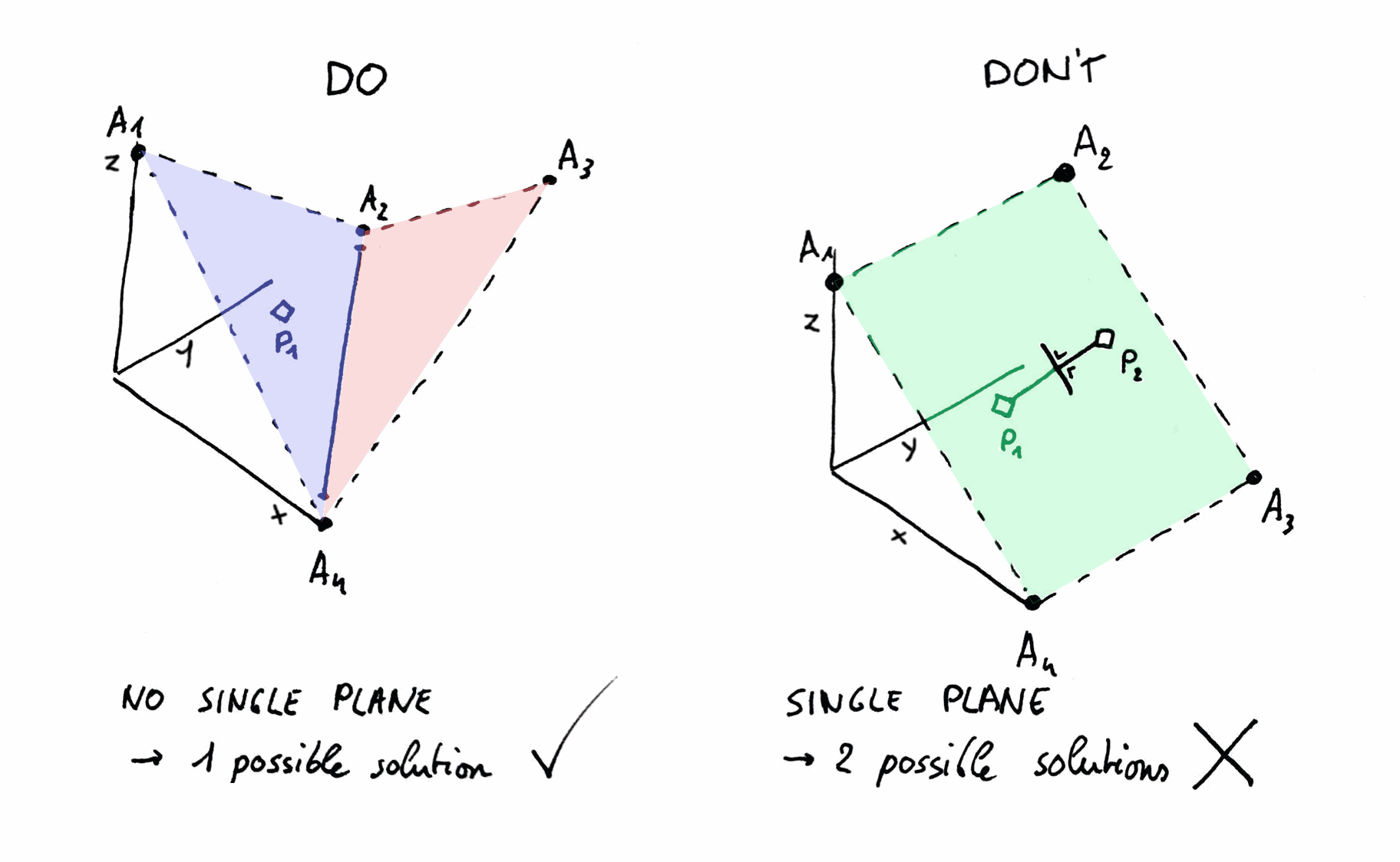 It is also important that the anchors do not lay in the same 3D plane, as this creates a mirror plane for the tag’s position, causing the tag’s position to jump around to its real and mirrored positions. This is visualized on the right side below.
