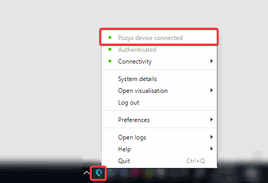 When you connect the tag to your computer, you can verify that it’s connected via the tray application, as it will change its icon and its menu will state that a device is connected. If your tag does not get recognized, you may have to try a different USB cable or follow the detailed troubleshooting when you click ‘No Pozyx device connected…’ in the tray application.