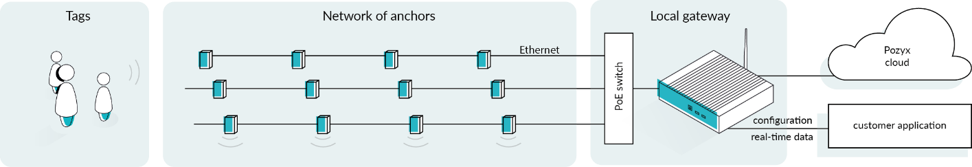A local positioning server: This device connects to the anchors through Ethernet. It gathers all the data received from the anchors and transforms this into a position. By connecting to the server, you can receive the real-time positioning data.