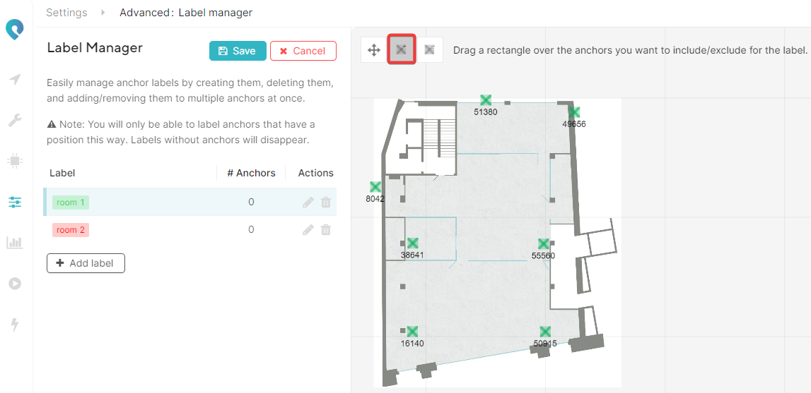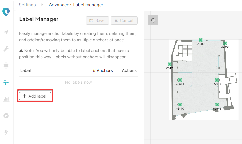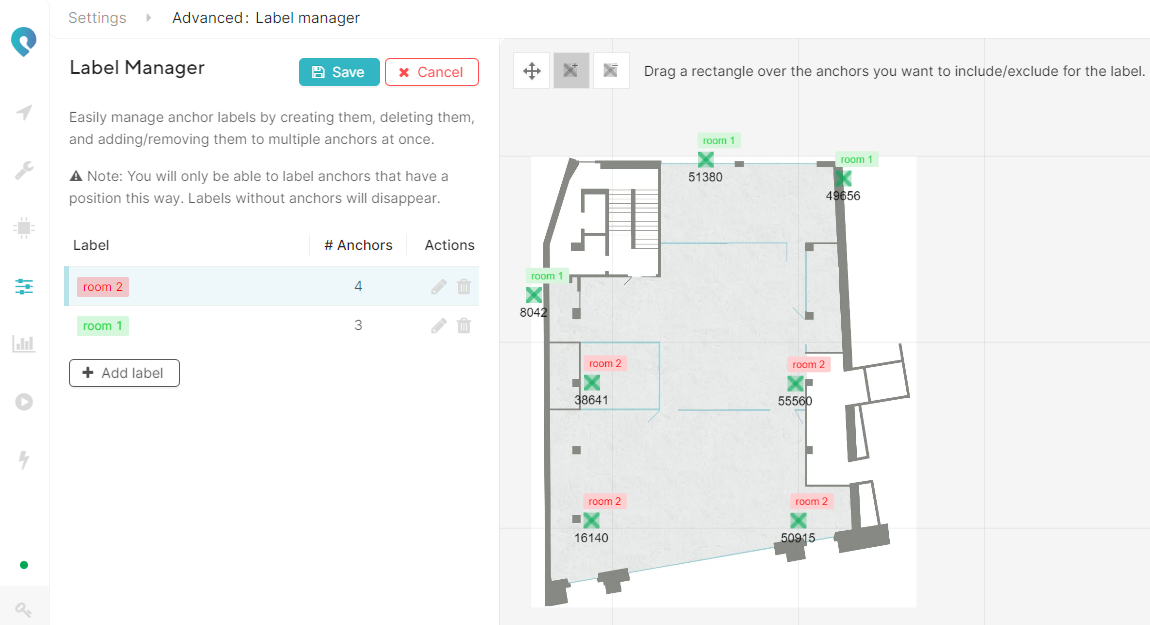 The label manager tool https://app.pozyx.io/settings/label-manager allows you to quickly assign different labels to certain (groups of) anchors with an easy click and drag operation. It is only possible to assign labels once the anchors have received coordinates.