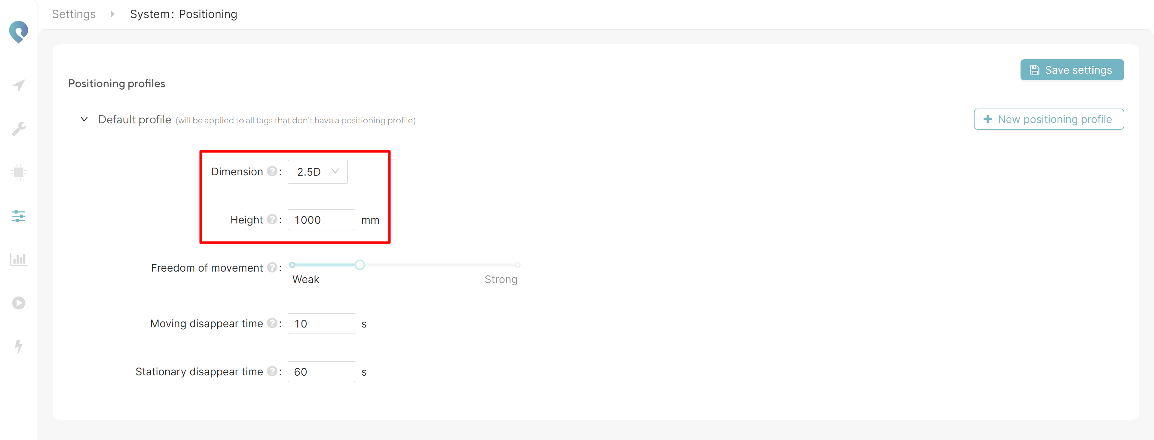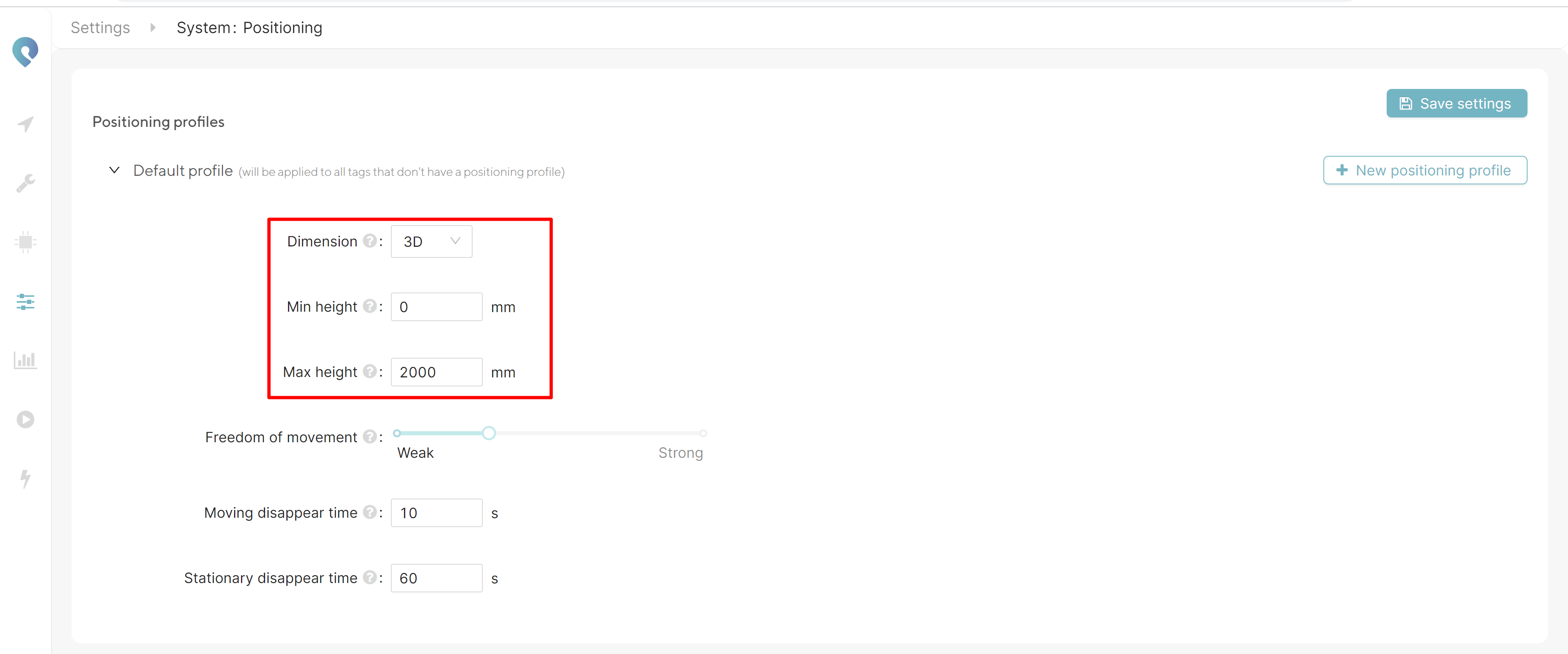 As your application may consist of different tags located on different heights or with different filter requirements, multiple positioning profiles with different settings can be defined. Per tag a different profile can be selected. The different options per profile are explained in more detail below.