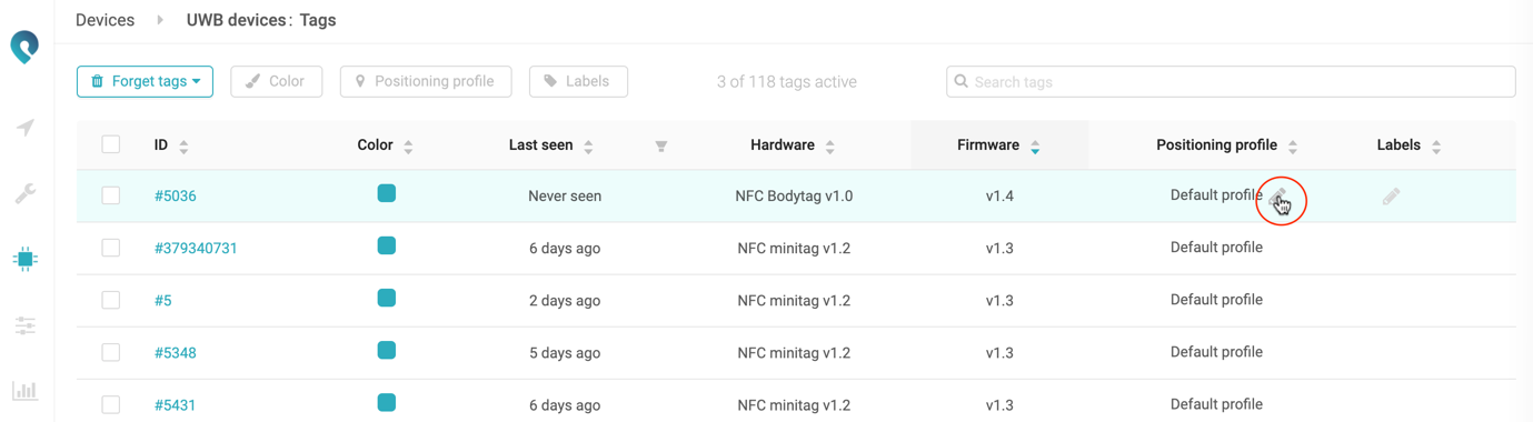 After creating a positioning profile, you can assign it to a tag by going to the Devices → Tags page and changing the positioning profile from the Default profile to the one that you want to assign: