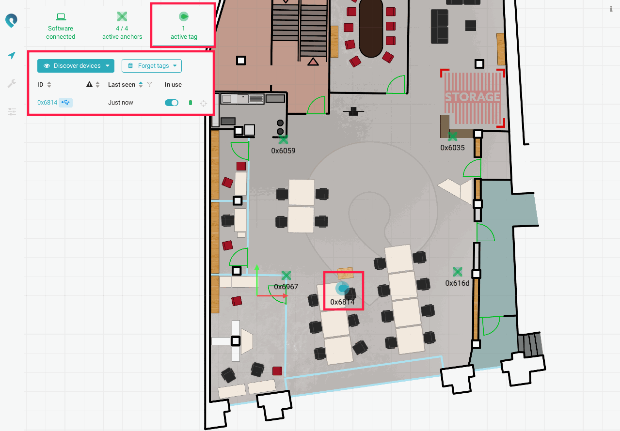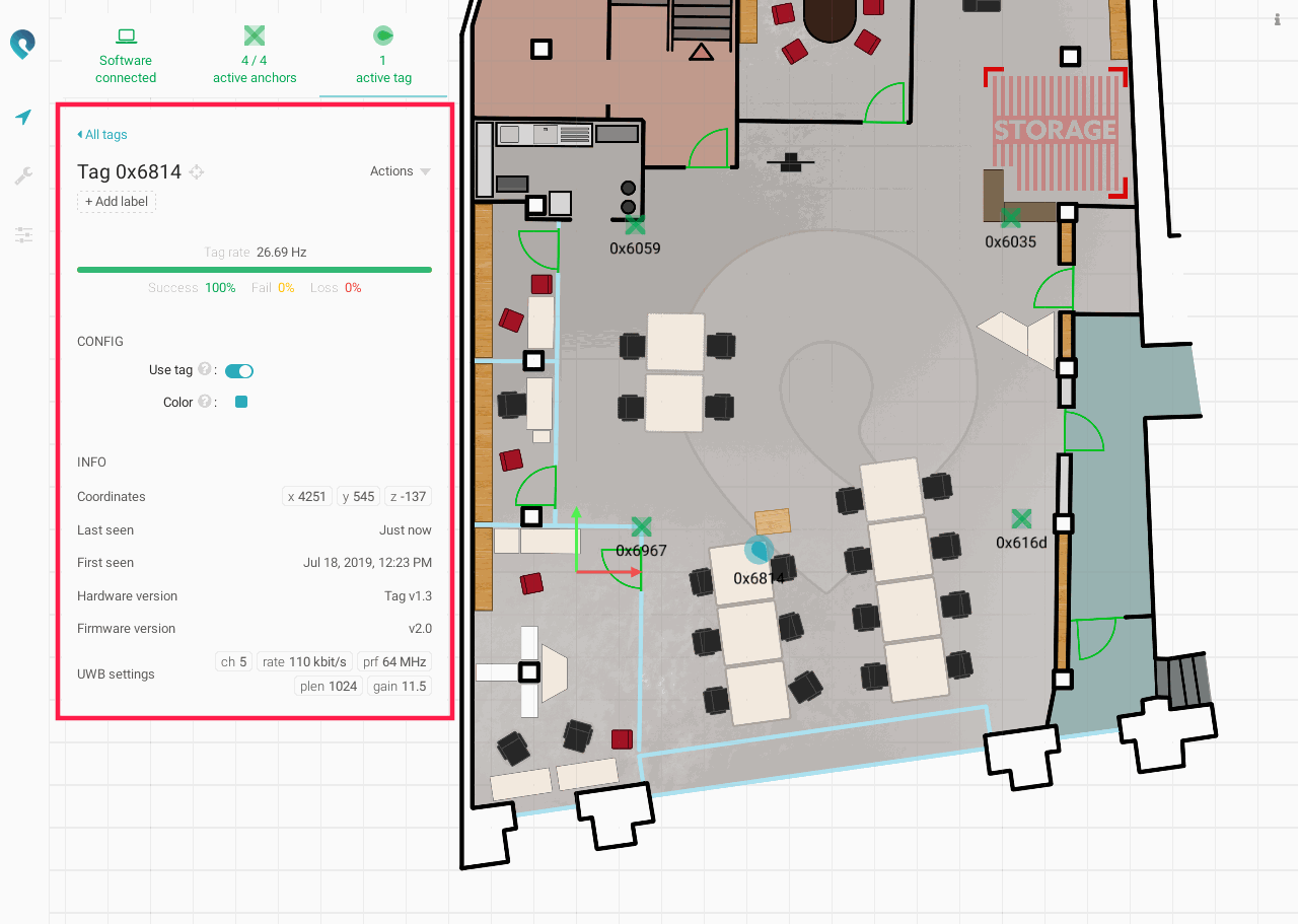 For tags, you can see the update rate, the current coordinates, the UWB settings… but also the firmware and hardware versions on the device. The selected tag will also be highlighted, and other tags will be shown less bright.