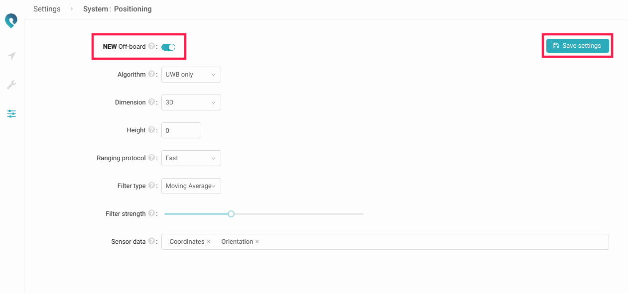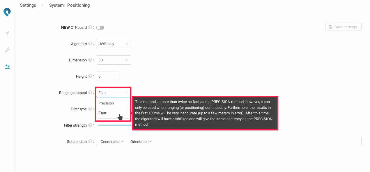 The positioning settings offer options to configure the operation of the positioning algorithm. The default settings should suffice for a lot of setups, offering a good update rate and good positioning performance.