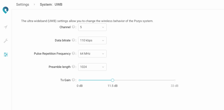 Tx gain: the UWB transmit power. The power can be set between 0 and 33 dB, and each channel has a default value. The maximum transmit power you can legally configure your devices with depends on your country.