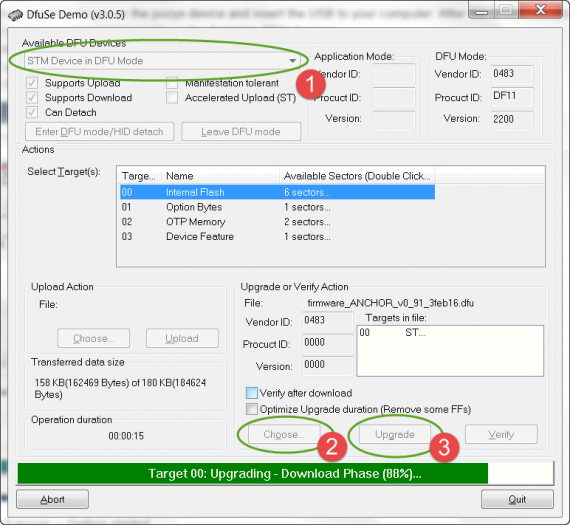 Updating the firmware with ST's DFU Tool is a relatively easy process which only requires a few steps. For a full technical description of the tool we refer to this application note from ST.