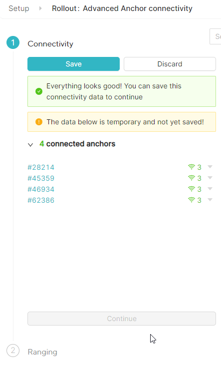 After running the connectivity the output will look similar to the results of the normal connectivity. Press save to save the values and then continue to go to the ranging step.